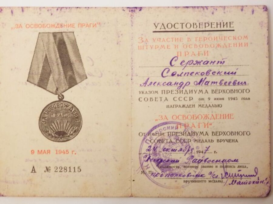 За мужество и героизм, проявленное советскими солдатами в Чехословакии в СССР была учреждена медаль «За освобождение Праги». Именно ей и наградили уже в 1947 году Александра Матвеевича Солпековского.