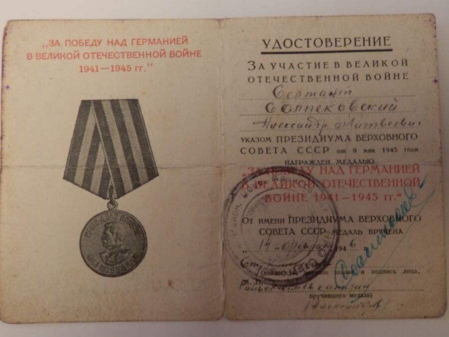 - Память о солдате мы бережно храним в семье и передаём из поколения в поколение, - сказал мне Александр СОЛПЕКОВСКИЙ. – Внук ветерана, как нетрудно догадаться, был назван в честь деда, который прошёл всю войну. О его фронтовом пути можно сказать словами выдающегося актёра Владимира САМОЙЛОВА: «Подвигов не совершал, но и спину фашистам не показывал!»
