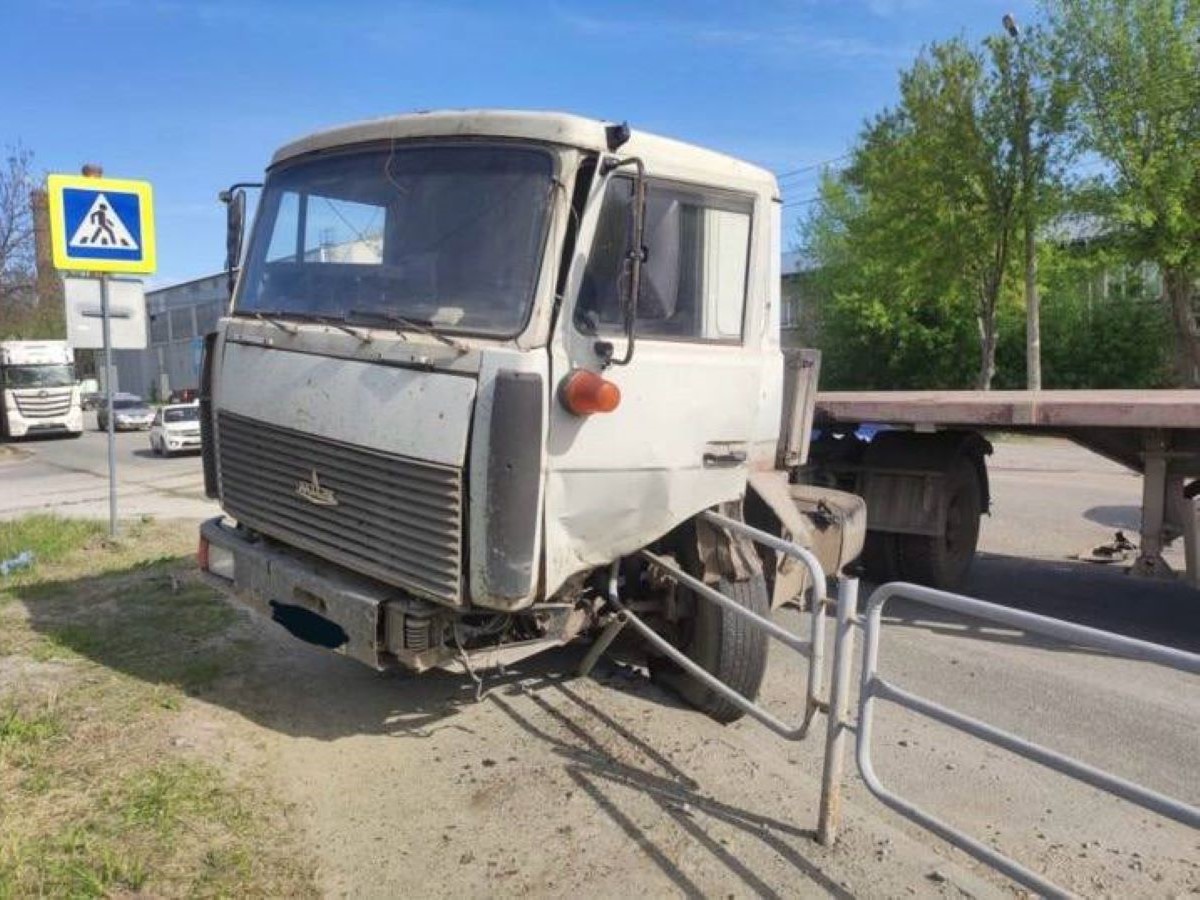 Грузовик МАЗ повис на дорожном ограждении после ДТП в Челябинске