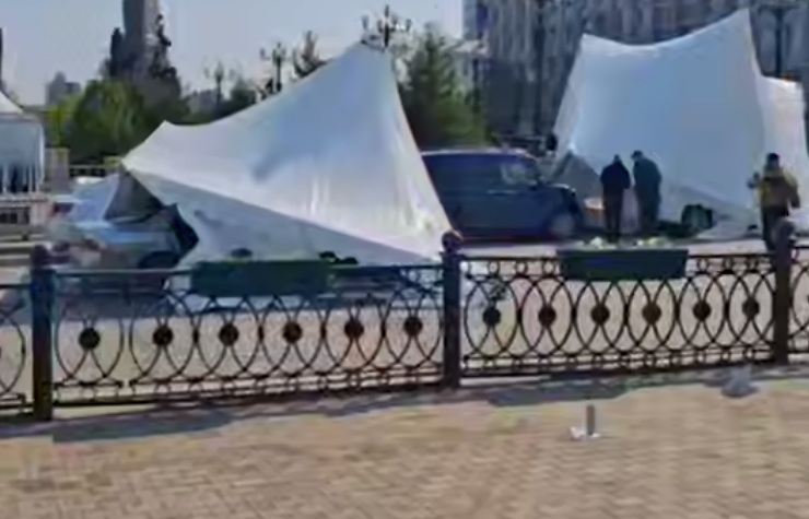 В Хабаровске днем 16 мая на Комсомольской площади из-за сильного ветра произошло необычное ЧП. Установлены для предстоящего «АмурФест.Весна» палатки снесло порывами на машины и провода