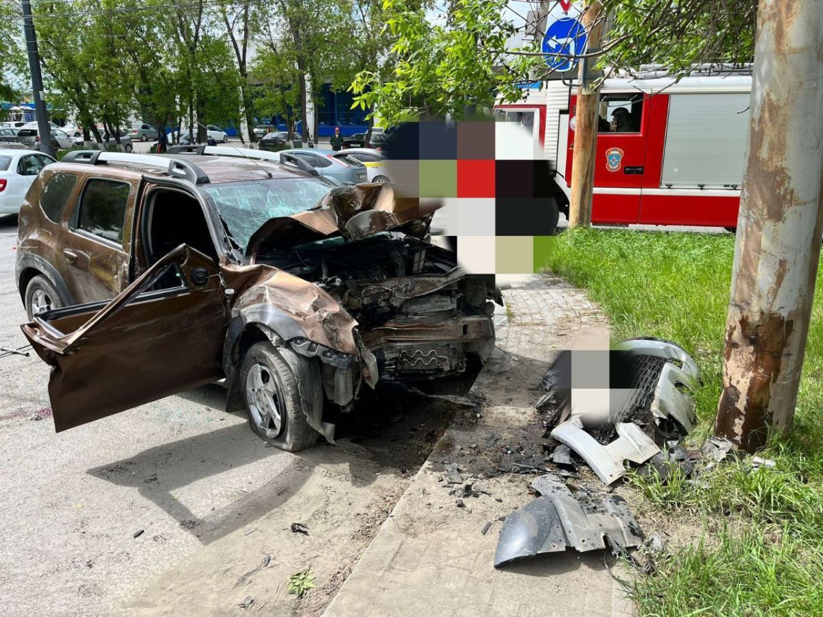 Днем 23 мая на улице Черкасская в Челябинске произошла мощная авария с двумя иномарками. От удара один из автомобилей вылетел с дороги и впечатался в электроопору.