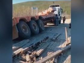 В Амурской области под весом проезжавшего большегруза с бульдозером на трале обрушился деревянный мост через реку Обка