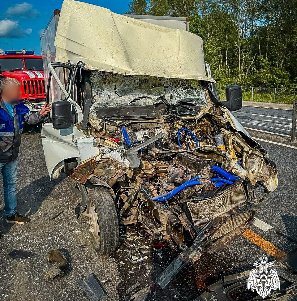 Жесткое ДТП произошло на 222-м километре трассы М-1 в Смоленской области. Вечером на дороге около деревни Мясоедово Вяземского округа столкнулись грузовая газель и фура. Машины двигались в попутном направлении. Удар был такой силы, что кузов деформировался и в кабине, как в ловушке, оказались заперты два человека.