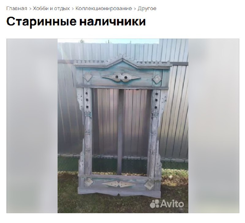 На опубликованном фотоснимке изображены восемь наличников. По внешним характеристикам размер наличников равняется тысяча двести на тысячу девятьсот. Продавцом Светланой были сделаны утончения, согласно которым состояние разное. Забирать изделие можно в селе Перевалово.