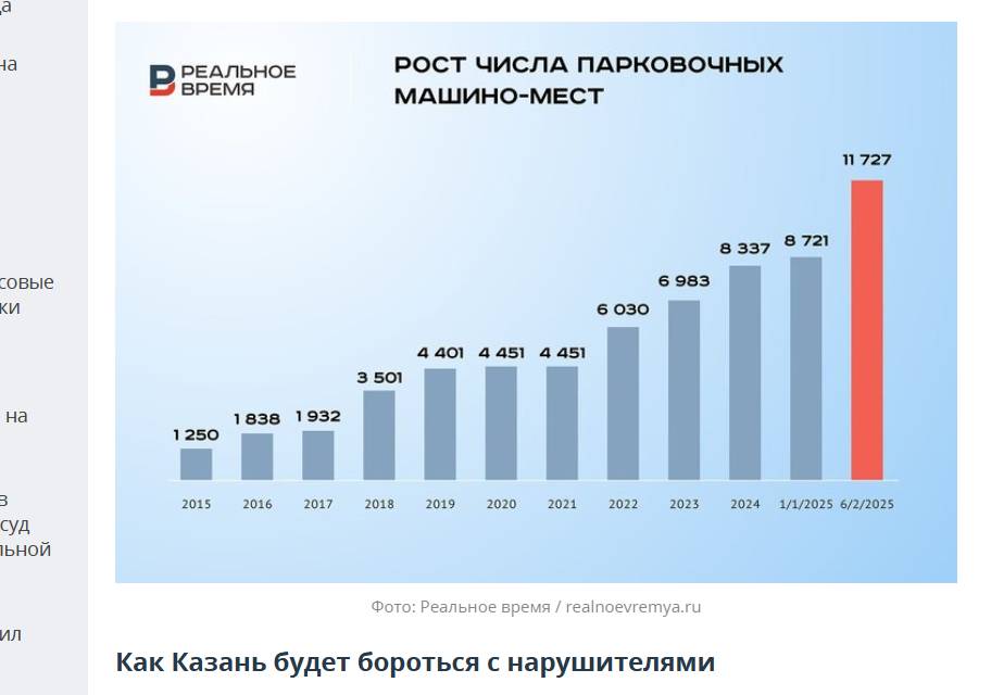 Казань, где с 2005 года число автомобилей утроилось до 485 тыс., продолжает экспансию платного паркинга. На «деловом понедельнике» глава комитета транспорта Алексей Сидоров анонсировал: к концу 2025 года в городе появится 13 тыс. платных парковочных мест, а к 2030-му — уже 30 тыс. Новые зоны охватят не только центр, но и спальные районы — улицы Журналистов, Карбышева, Кирпичникова, Спортивная, Роторная. Платные парковки уже увеличили скорость движения в городе на 9% (до 35 км/ч) и сократили время проезда на 7–9 минут.