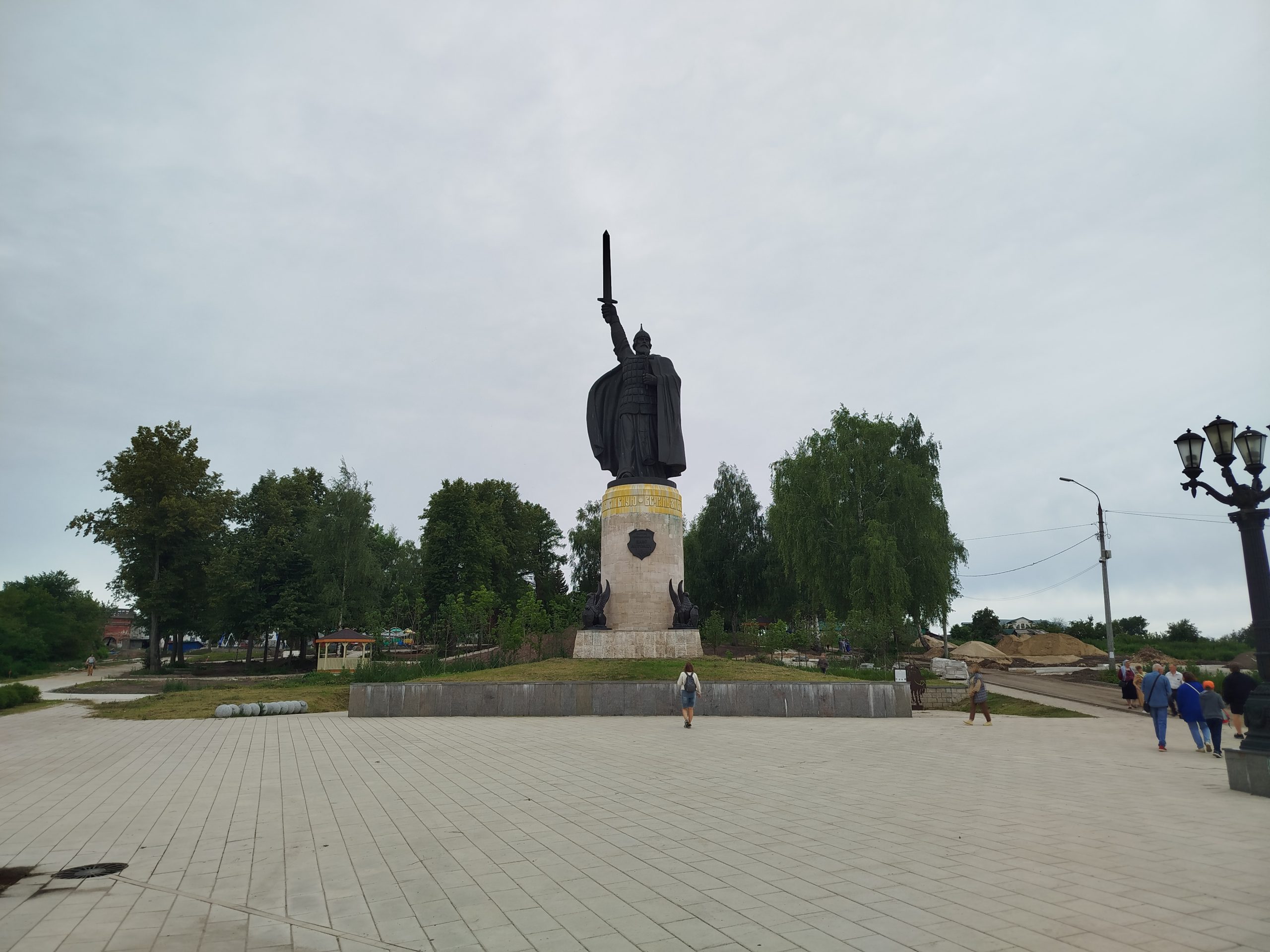 Первый установлен в 1999 году в Окском парке, на высоком берегу Оки. Автор - скульптор Вячеслав Клыков. В фигуре богатыря воплощён образ воина-монаха. Илья одет в кольчугу, из-под которой видна монашеская ряса, а его голову защищает традиционный русский шлем. Левой рукой богатырь прижимает к груди православный крест, а правой рукой грозно возносит меч над головой. Высота памятника от меча до цилиндрического постамента - 21 метр. У постамента установлены грифоны - символы мощи и победы.