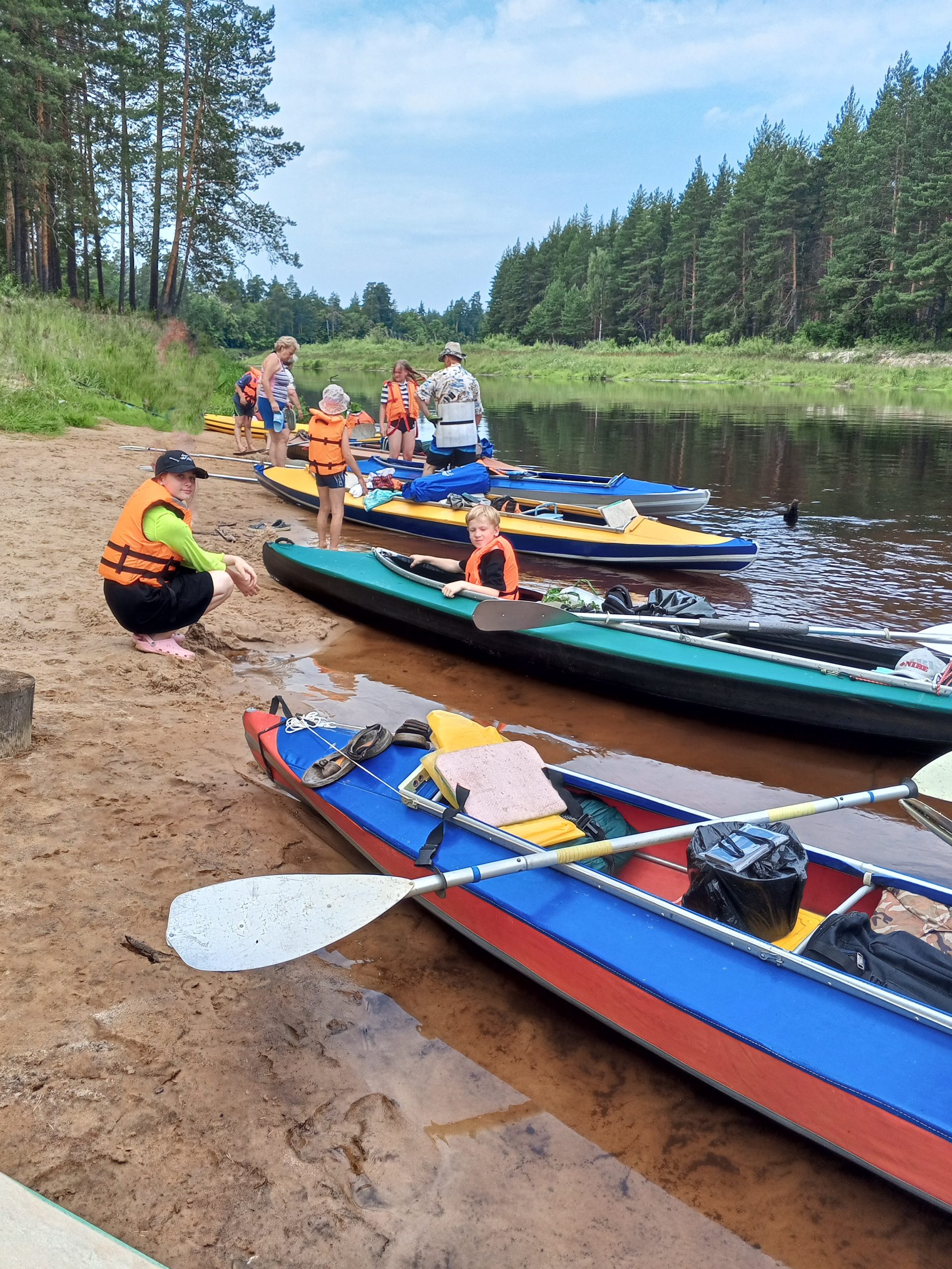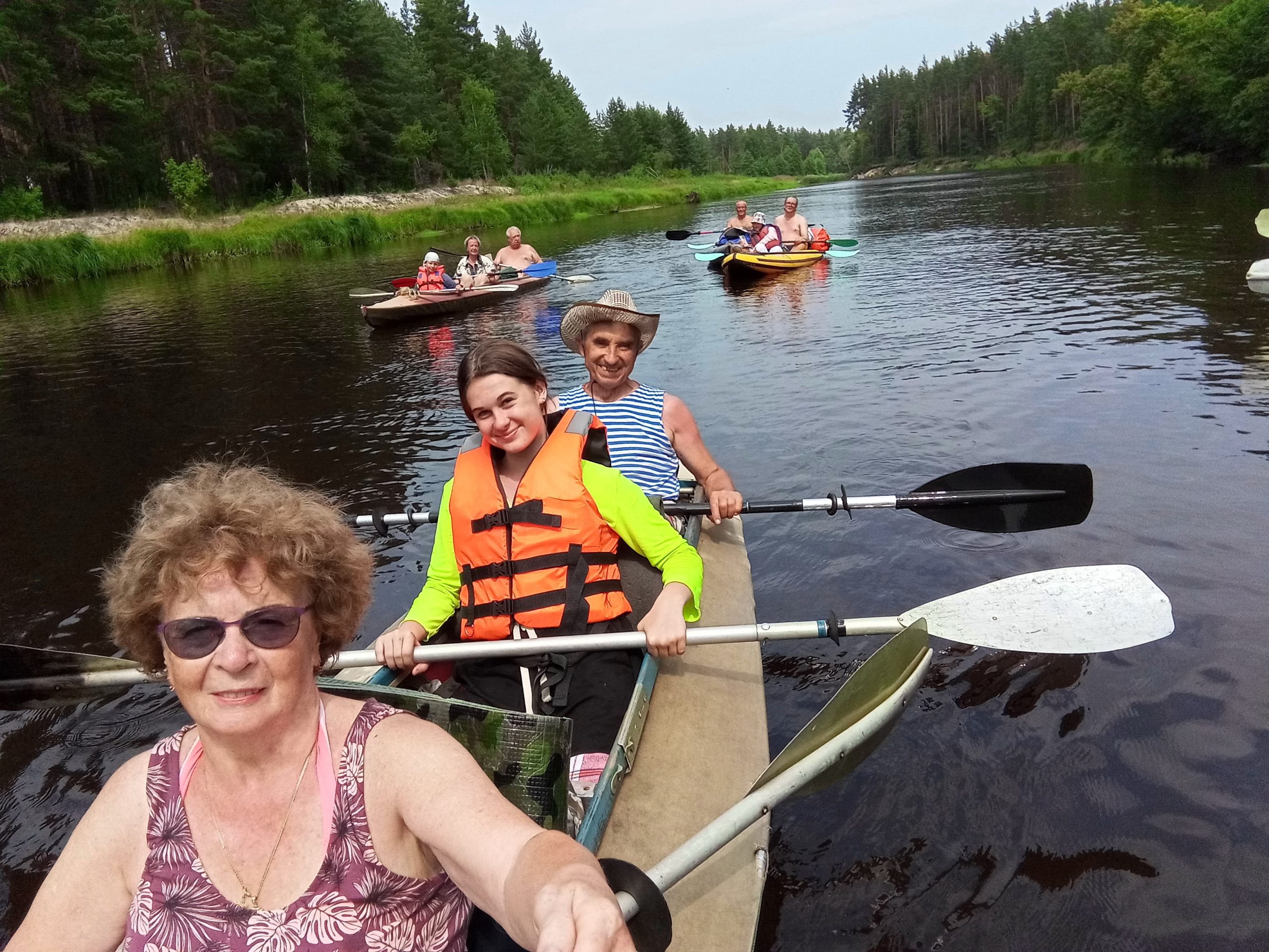 Интересно было разглядывать другие команды на маршруте. Вот ребята из Нижнего. Состав юниорский, но по виду уверенно работающие веслом. А вот флотилия надувных плавсредств, под мотором с флагманским судном впереди под российским триколором. Впечатляет. Ещё на одном надувном плоту разместилось сразу с десяток пассажиров и только один гребец тащил всю эту компанию. Забавно. Вообще байдарок разного калибра сейчас много. Их легко купить на разных маркетплейсах. К слову сказать, в нашей команде были и ветераны байдарочного флота. У нас, например - старый брезентовый «Салют», местами сильно потёртый и много раз проклеенный. Он и внешне не такой яркий, как новые надувные байдарки (простые в сборке и лёгкие в транспортировке). Тем не менее на ходу и при слаженных действиях наша старая лодка показала свои хорошие ходовые качества и устойчивость.