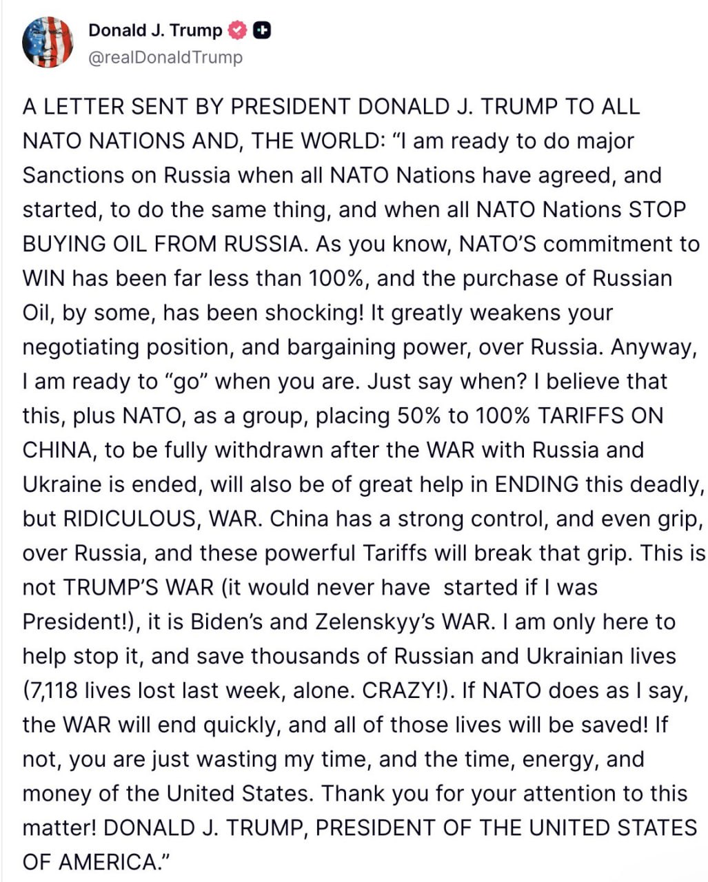 • Во-первых, Трамп подогревает американцев миром: опросы Fox News показывают, 62% избирателей устали от Украины, хотят «сделку». Давление на НАТО — способ переложить вину на Европу («вы покупаете, мы санкционируем»).