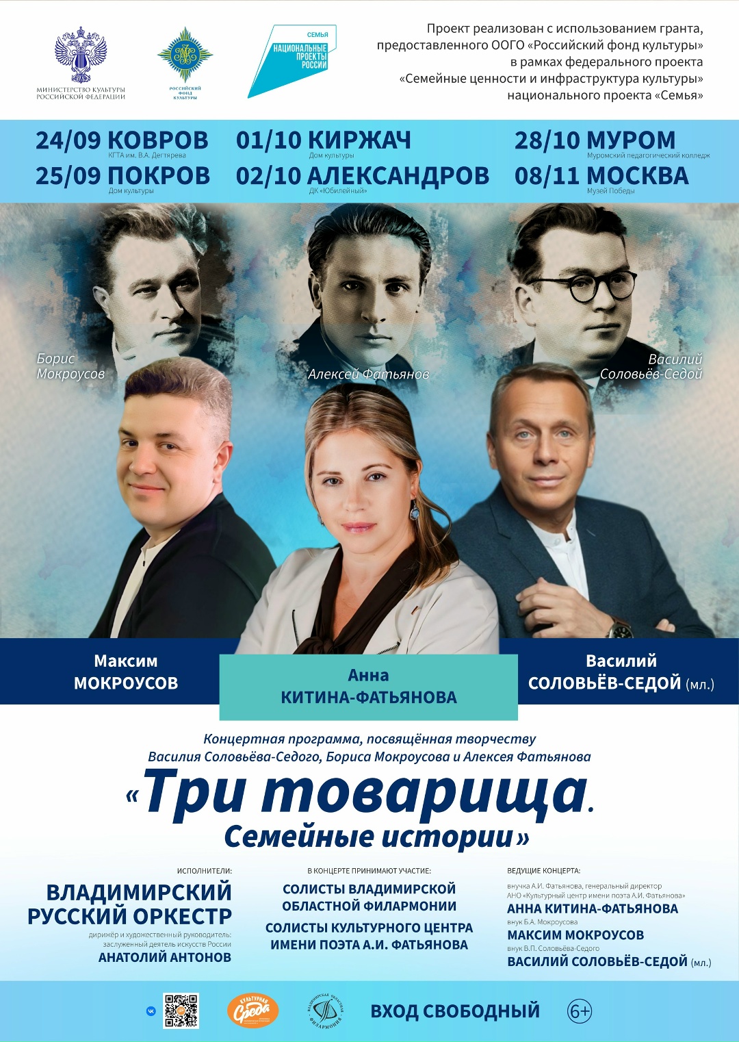 - Подготовленный нами проект «Три товарища. Семейные истории» - это программа о дружбе, которая сплотила трех выдающихся художников слова и мелодии; дружбе настолько крепкой, что она пережила самих трех товарищей и существует сейчас не только в их песнях, но и в поколениях их потомков. Внучка Фатьянова – Анна, внуки Мокроусова и Соловьева-Седого – Максим и Василий – тоже очень дружны между собой и делают все возможное, чтобы песни их дедов по-прежнему звучали, - рассказывает руководитель АНО «Культурная среда» Наталья Задрогина. - В ближайшее время во Владимирской области стартует серия концертов, ведущими которых будут три внука выдающихся творцов. Прозвучат не только стихи и песни Алексея Фатьянова, Василия Соловьева-Седого и Бориса Мокроусова, но и рассказы о семейных традициях, интересные факты из их жизни, воспоминания о знакомстве и совместной работе.