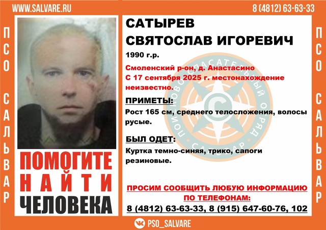 Добровольцы ПСО «Сальвар» объявили о старте активных поисков пропавшего почти неделю назад человека. 35-летнего Святослава Сатырева последний раз видели 17 сентября в деревне Анастасьино. При нем не было ни сумок с вещами, ни корзин, ни других «маячков», сигнализирующих, что он может куда-то уехать. Одет был по-простому: в резиновые сапоги, трико и темно-синюю куртку. Куда исчез мужчина – загадка.