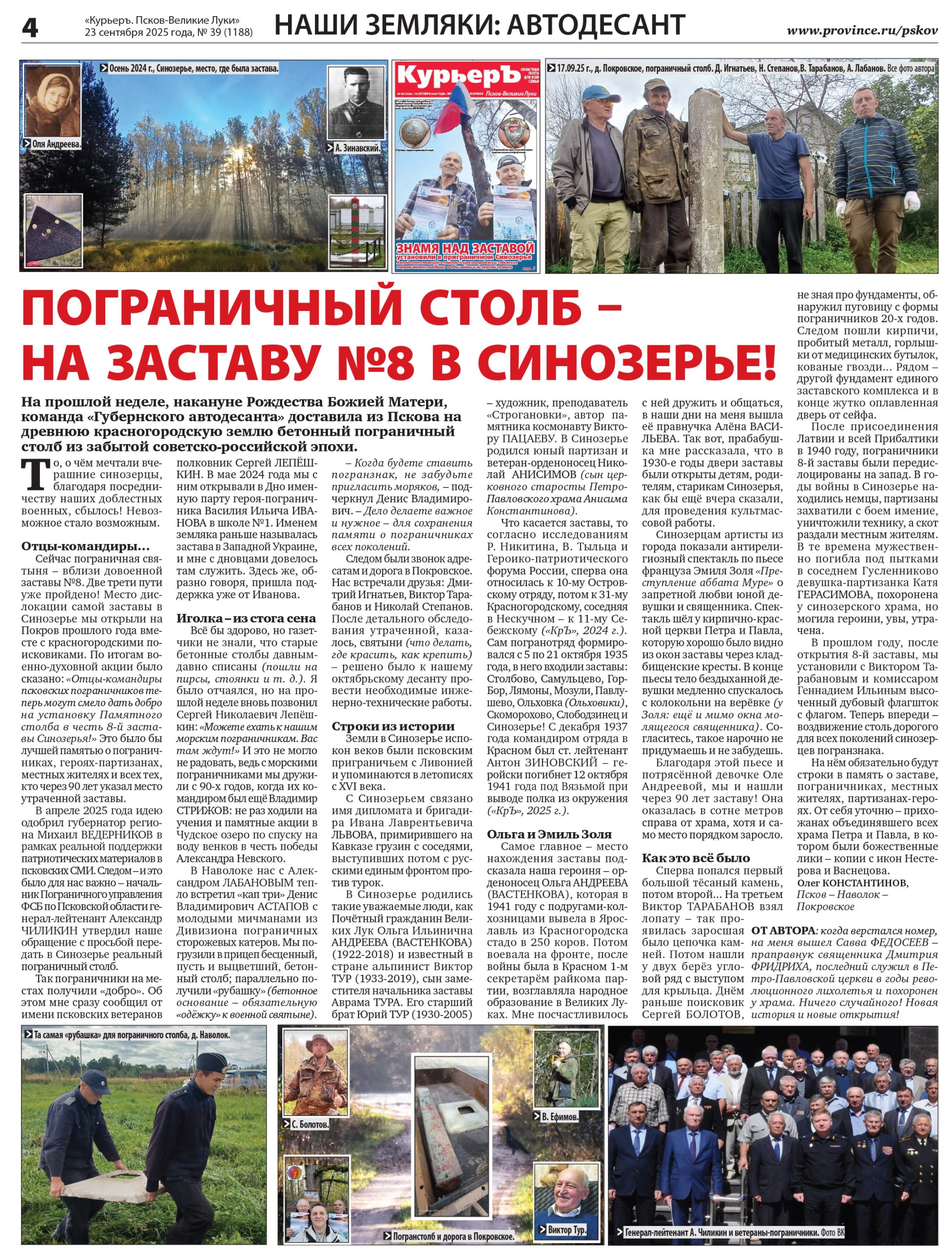 В апреле 2025 года идею одобрил губернатор региона Михаил ВЕДЕРНИКОВ в рамках реальной поддержки патриотических материалов в псковских СМИ. Следом – и это было для нас важно – начальник Пограничного управления ФСБ по Псковской области генерал-майор Александр ЧИЛИКИН утвердил наше обращение с просьбой передать в Синозерье реальный пограничный столб.