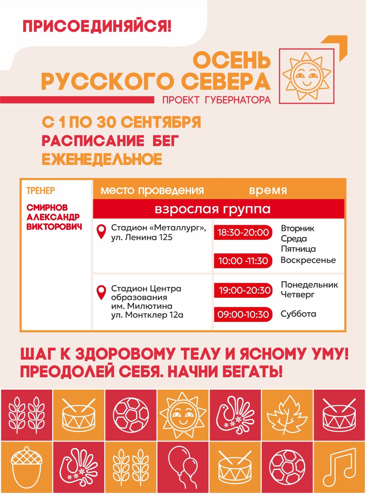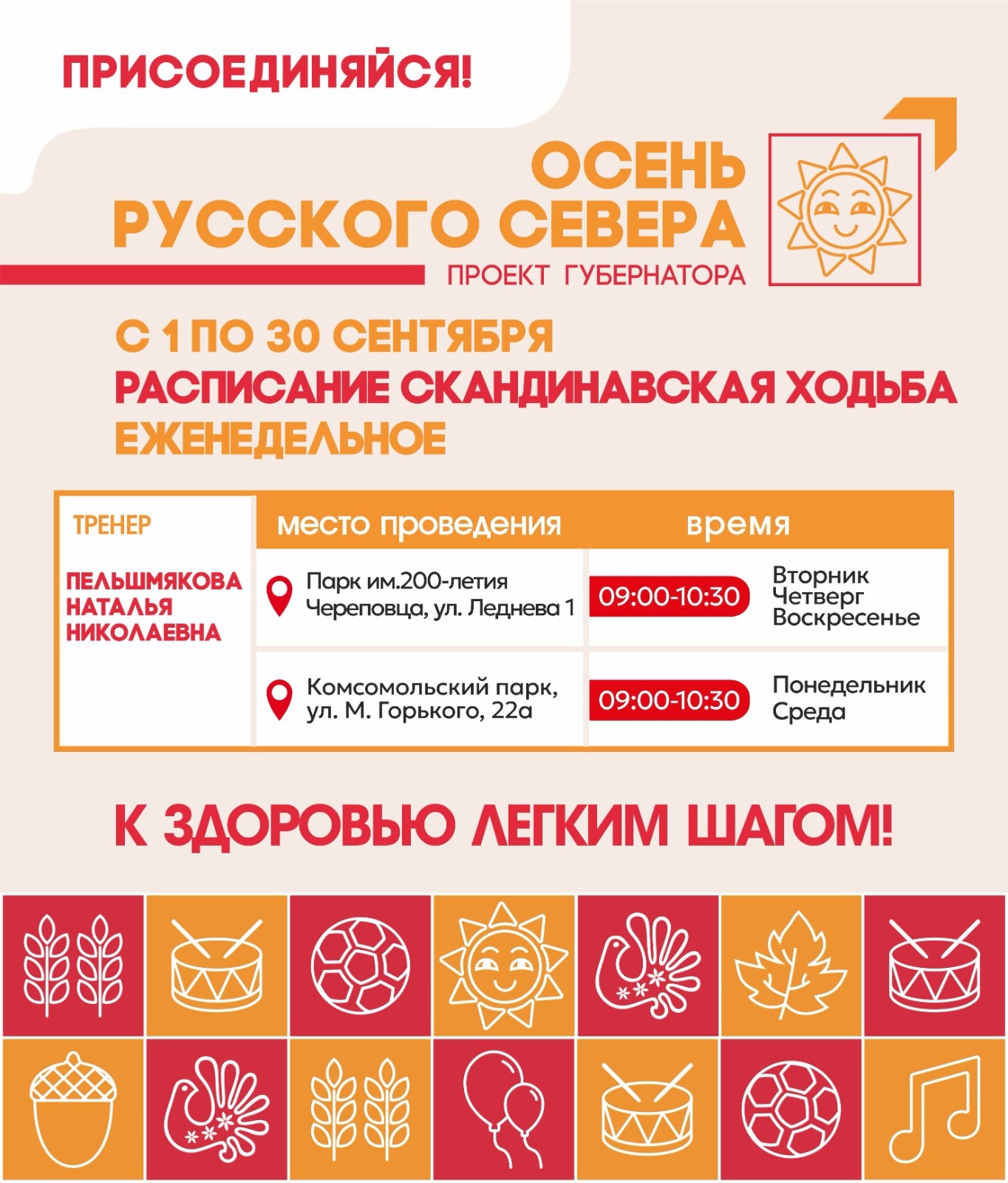 Спортивный клуб «Череповец» приглашает всех желающих на бесплатные тренировки по бегу и скандинавской ходьбе в рамках губернаторского проекта «Осень Русского Севера». Занятия проводятся опытными инструкторами проекта «Народный тренер» в живописных уголках города: в парках, на стадионе «Металлург» и специально оборудованных тропах здоровья. Подробное расписание и места проведения тренировок доступны в группе СК Череповец.