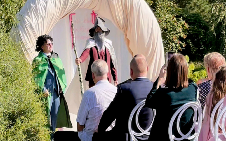 Для церемонии была выбрана тема вселенной «Властелина колец»: жених облачился в костюм могущественного мага, а невеста выглядела как истинная принцесса сказочного королевства. Даже обручальное кольцо было вручено молодым особым образом – его принес друг пары, наряженный в образ знаменитого хоббита!