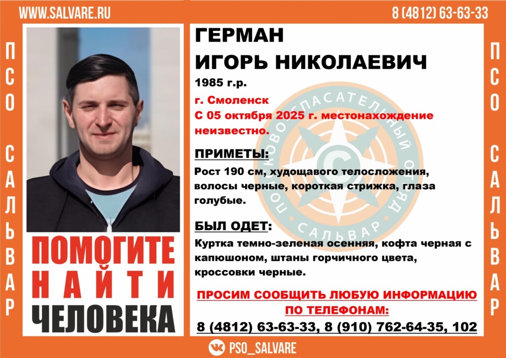 Игорь Николаевич Герман пропал 5 октября в Смоленске. С собой он не взял ни рюкзака, ни сумки, то есть уезжать не собирался. Оделся по погоде, аккуратно: в штаны горчичного цвета, темно-зеленую куртку и черные кроссовки.