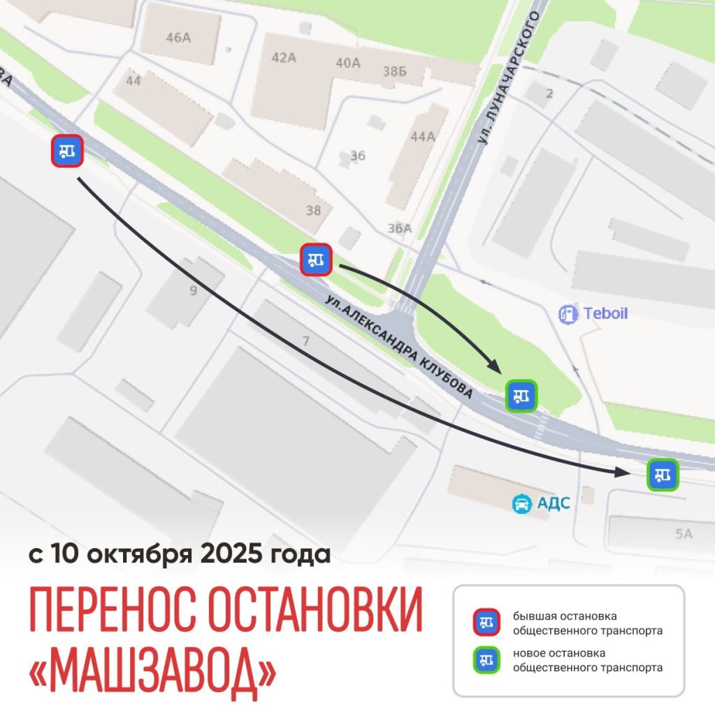 Вологжане, внимание: с 10 октября 2025 года остановка «Машзавод» исчезнет — ее объединят с соседней для удобства. Расстояние всего 150 м, так что пешком дойдете за минуту. Изменения коснутся пяти пригородных маршрутов: №412 «Вологда – Заря», №406 и 408 «Вологда – Виктово», №403 и 405 «Вологда – Кубенское». Теперь посадка и высадка — на новом пункте «Улица Луначарского» у АЗС.