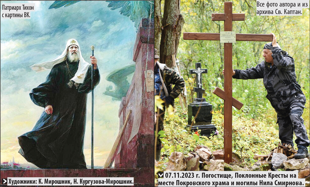 А в Погостище на линию «Пантера», где до Америки два года служил Павел РАТЬКОВСКИЙ, мы с друзьями прорывались не один раз. Сделали в 2023 году второй основательный Поклонный Крест, сломанный бурей, на месте взорванного Покровского храма, сложив у Голгофы вырытые чёрными копателями бульдозером косточки. Восстановили гранитный Крест и на могиле Нила СМИРНОВА (установленный в 1900 году любящей женой Марией и сестрой Павла Ратьковского).