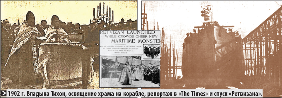 Именно в Америке будущий патриарх ТИХОН и корабельный батюшка РАТЬКОВСКИЙ освятили броненосец «РетвизанЪ», который строился на одной верфи вместе с легендарным «Варягом» (стапельный №300).