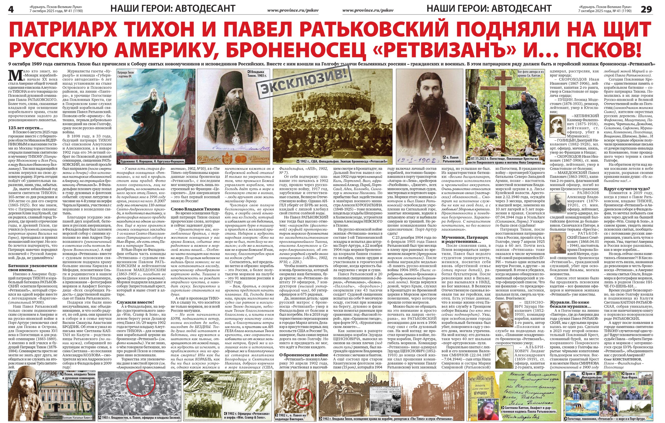 Патриарх Тихон и Павел Ратьковский подняли на щит русскую Америку, броненосец «РетвизанЪ» и Псков