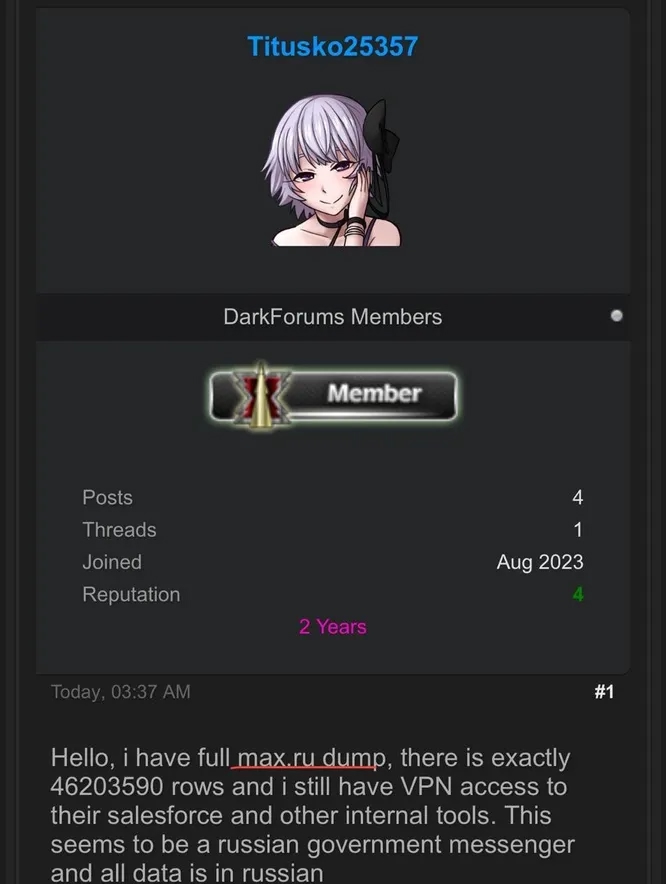 Хакеры заявили, что получили полный дамп базы данных сервиса. Объявление появилось на DarkForums: пользователь Titusko25357 утверждает, что в его руках 46 203 590 строк данных, и в качестве доказательства уже выложил часть утечки.