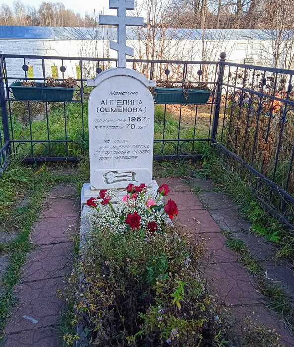 Советская власть непокорность монахини оценила по своему. Ангелина 17 лет провела в лагерях. После освобождения до конца своих дней жила в Санино, где и скончалась в возрасте 70 лет. Похоронили монахиню на местном кладбище рядом с храмами, которые она столь бесстрашно защищала. Об этом свидетельствует надпись на могиле монахини: «За Христа в заточении лютые страдания и скорби претерпевшая». Память её свято чтится в Обители.