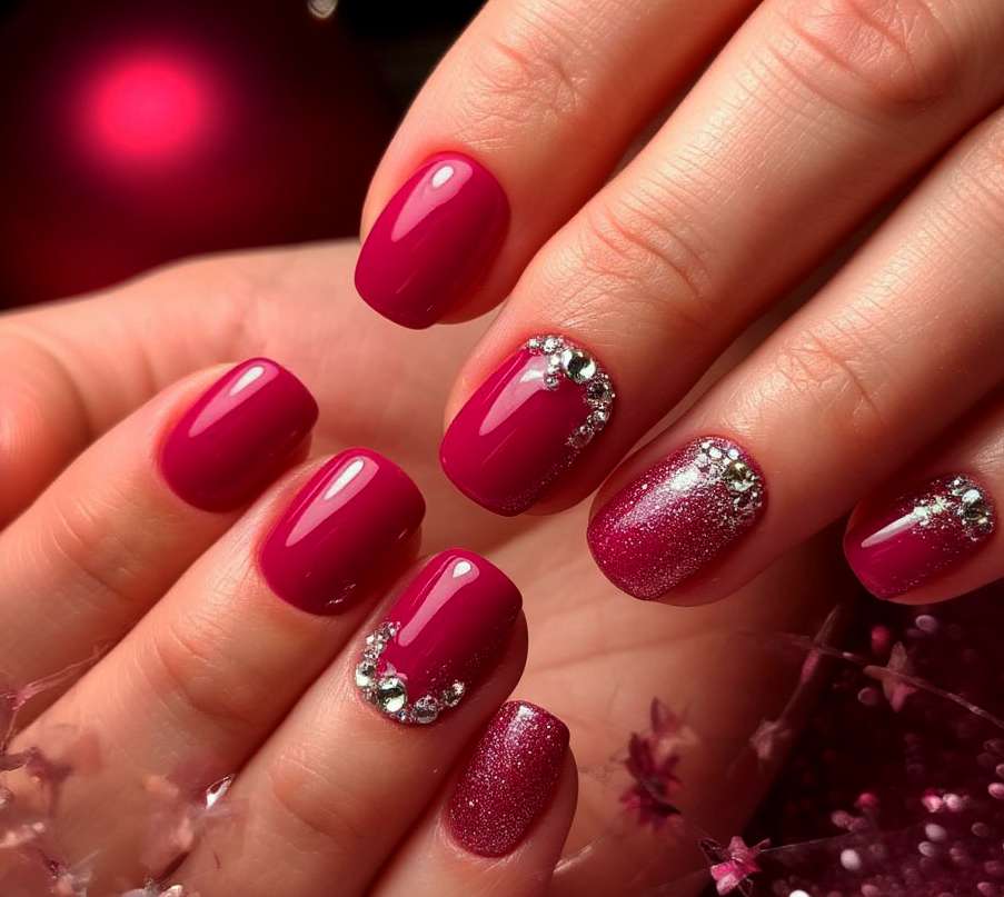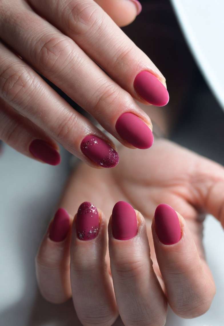 Блеск добавляют совсем немного: тонкую золотую полоску посередине, пару серебряных снежинок или капельку фольги, будто иней на ягодах. Кто-то выбирает мягкий матовый топ — и тогда маникюр становится бархатным, хочется трогать руками. А кто-то берёт лёгкий шиммерный топ — и малина начинает тихо переливаться, как замороженная ягода на солнце.
