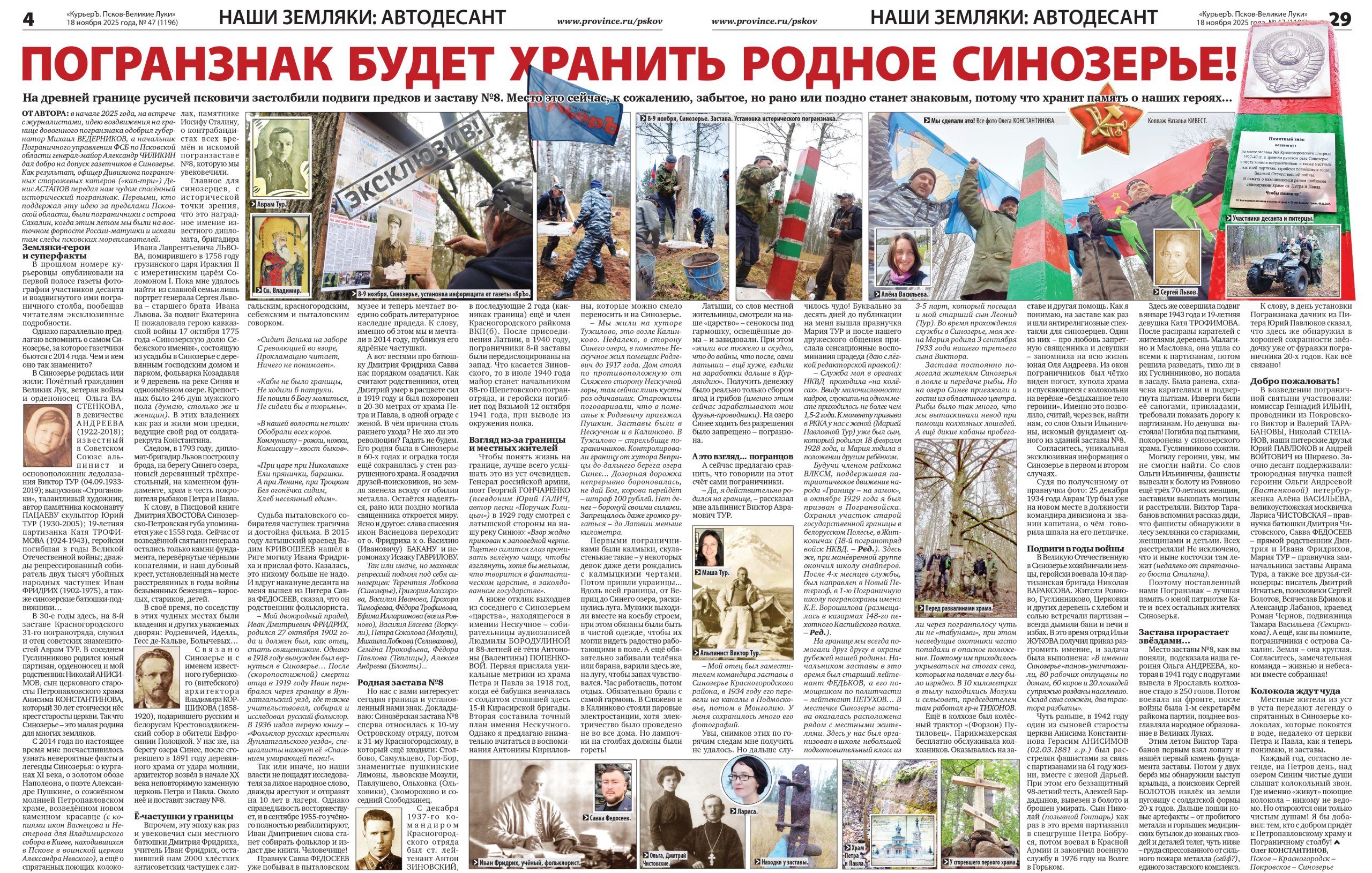 ОТ АВТОРА: в начале 2025 года, на встрече с журналистами, идею воздвижения на границе довоенного погранзнака одобрил псковский губернатор Михаил ВЕДЕРНИКОВ, а начальник Пограничного управления ФСБ по Псковской области генерал-майор Александр ЧИЛИКИН дал добро на это патриотическое дело и допуск газетчиков в Синозерье. Как результат, офицеры и мичманы Дивизиона пограничных сторожевых катеров передали чудом спасённый исторический бетонный погранзнак.