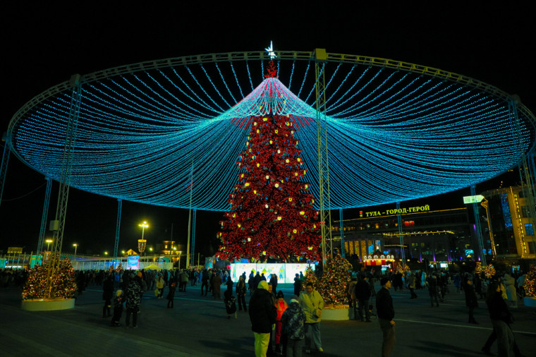 Новая ель – самая высокая искусственная стволовая ель в России. Ее высота - 32 метра. Украшена она мультимедийным шатром диаметром 60 м с управляемой гирляндой и видеоэффектами. Общая протяженность гирлянды 30 км – это 300 тысяч диодов и свыше 30 световых программ. Главную елку города украшают яркие символы Тулы – игрушки в виде пряников, самоваров и подков. На открытии рекордная высота елки была зафиксирована Книгой рекордов России.