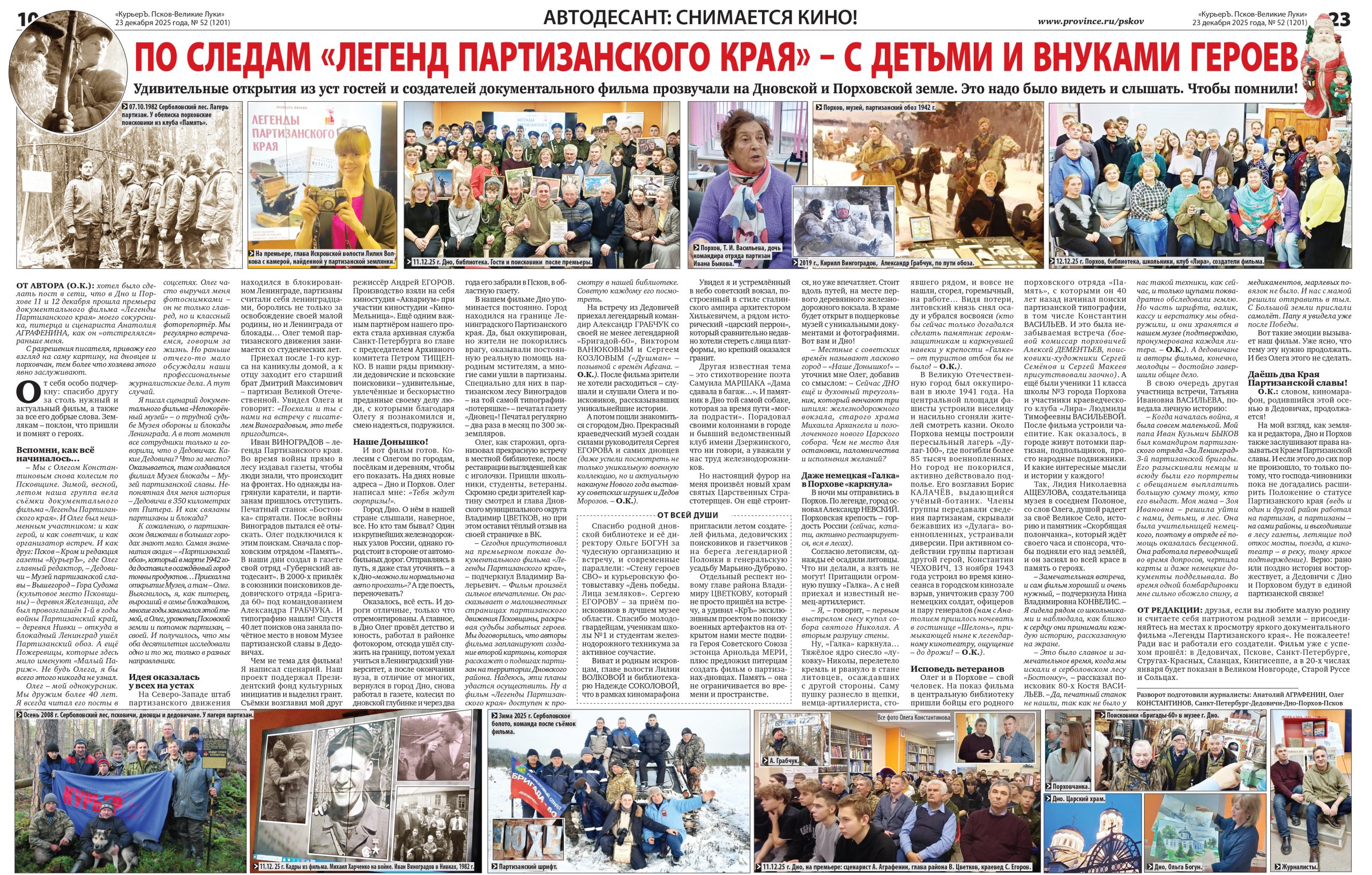 – Мы с Олегом Константиновым снова колесим по Псковщине. Зимой, весной, летом наша группа вела съёмки документального фильма «Легенды Партизанского края». И Олег был неизменным участником: и как герой, и как советчик, и как организатор встреч. И как друг: Псков – Кром и редакция газеты «КурьерЪ», где Олег главный редактор, – Дедовичи – Музей партизанской славы – Вышегород – Гора Судома (культовое место Псковщины) – деревня Железница, где был провозглашён 1-й в годы войны Партизанский край, – деревня Нивки – откуда в блокадный Ленинград ушёл Партизанский обоз. А ещё Пожеревицы, которые здесь мило именуют «Малый Париж». Не будь Олега, я бы всего этого никогда не узнал.