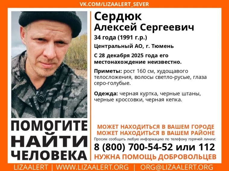 Начиная с двадцать восьмого декабря две тысячи двадцать пятого года в городе Тюмени ведутся поиски тридцатичетырехлётнего пропавшего мужчины по имени - Алексей Сердюк. Ориентировка о пропаже была опубликована на сайте «Лиза Алерт». Согласно имеющейся информации с двадцать восьмого декабря нет никакой информации о местонахождении мужчины.