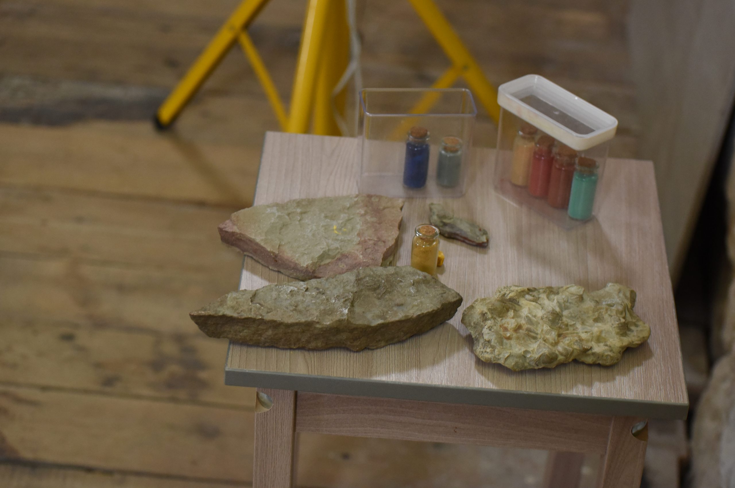 - известь, глауконит (кристалл с зеленым оттенком) и охру, добытую ими в своё время из пластов Снятной горы. Что-то из «волшебных» камешков нашлось и в самом монастыре. Также наставники подготовили для работы и специальные кессоны – формы, типа ящиков, куда закладывается сырая штукатурка, на которую наши предки-художники и наносили рисунок. Далее, под руководством художников, ребята самостоятельно дробили камни. Затем размалывали их в крошку и перетирали в порошок в специальной ступке пестиком – очень кропотливый и трудоёмкий процесс, требующий терпения и усидчивости. После этого порошки смешивались в нужных пропорциях с водой и – вот она, чудо-краска, данная самой горой!