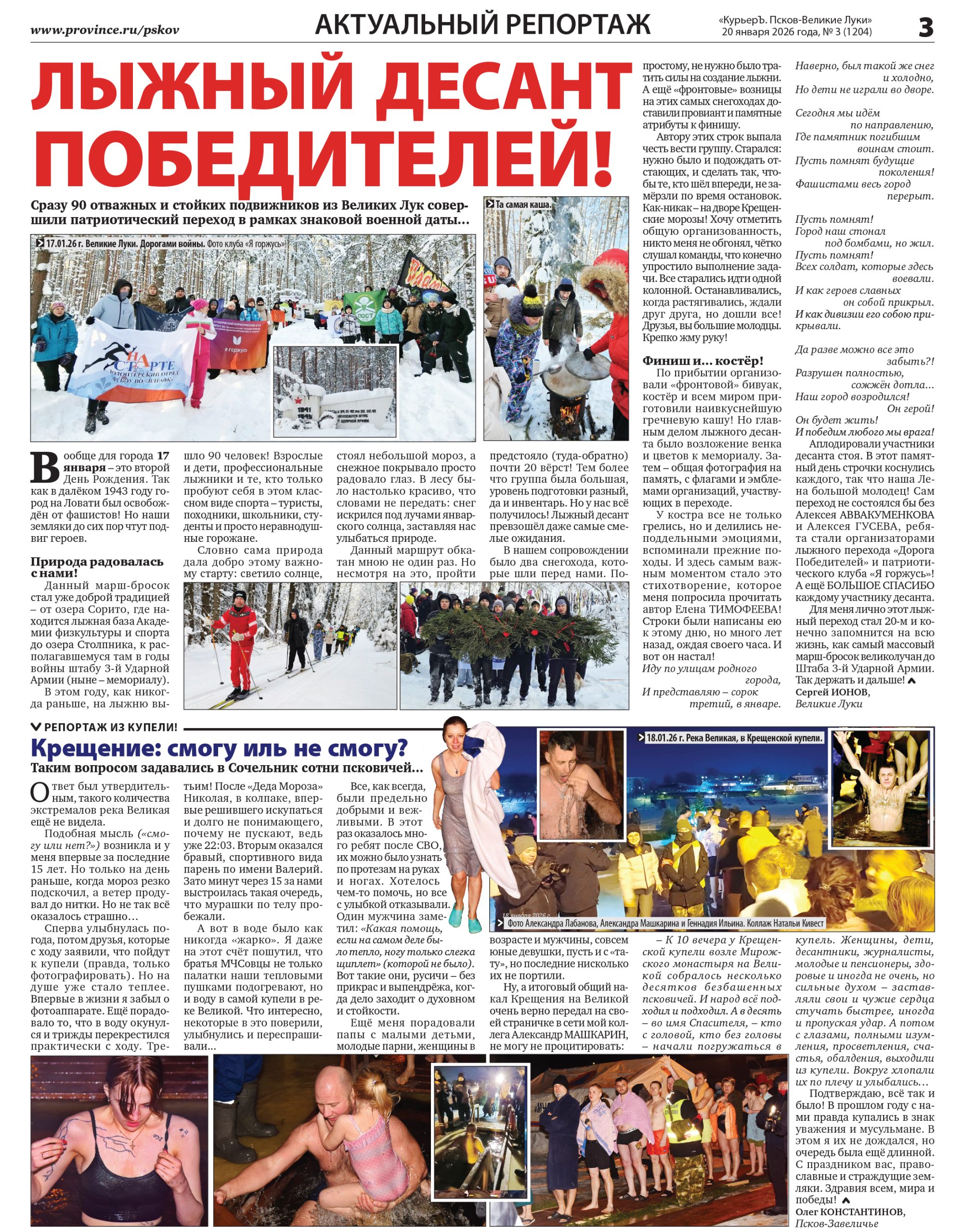 – К 10 вечера у Крещенской купели возле Мирожского монастыря на Великой собралось несколько десятков безбашенных псковичей. И народ всё подходил и подходил. А в десять – во имя Спасителя, – кто с головой, кто без головы – начали погружаться в купель. Женщины, дети, десантники, журналисты, молодые и пенсионеры, здоровые и иногда не очень, но сильные духом – заставляли свои и чужие сердца стучать быстрее, иногда и пропуская удар. А потом с глазами, полными изумления, просветления, счастья, обалдения, выходили из купели. Вокруг хлопали их по плечу и улыбались…