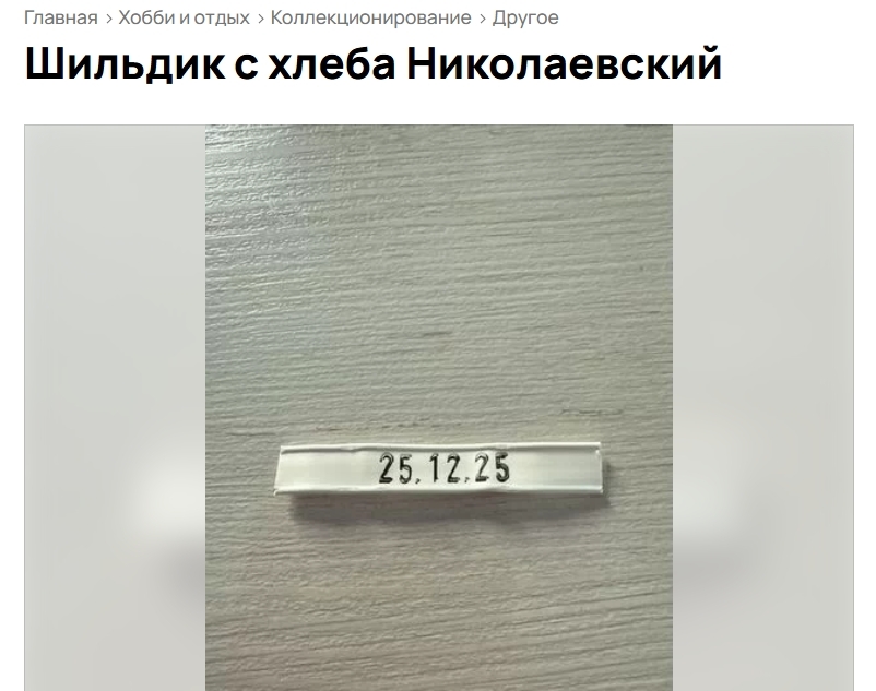 Иногда объявление о продаже того или иного объекта или предмета состоит всего из одной строки. Сейчас тюменцы решили предложить к приобретению шильдик с хлеба «Николаевский» с красивой датой. За шильдик продавец просит одну тысячу рублей.