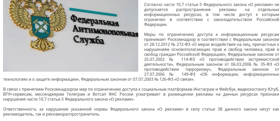 "В связи с принятием Роскомнадзором мер по ограничению доступа к социальным платформам Instagram** и Facebook**, видеохостингу YouTube, VPN-сервисам, мессенджерам Telegram и WhatsApp* ФАС усматривает в размещении рекламы на данных ресурсах признаки нарушения ч.10.7 ст. 5 федерального закона «О рекламе».
