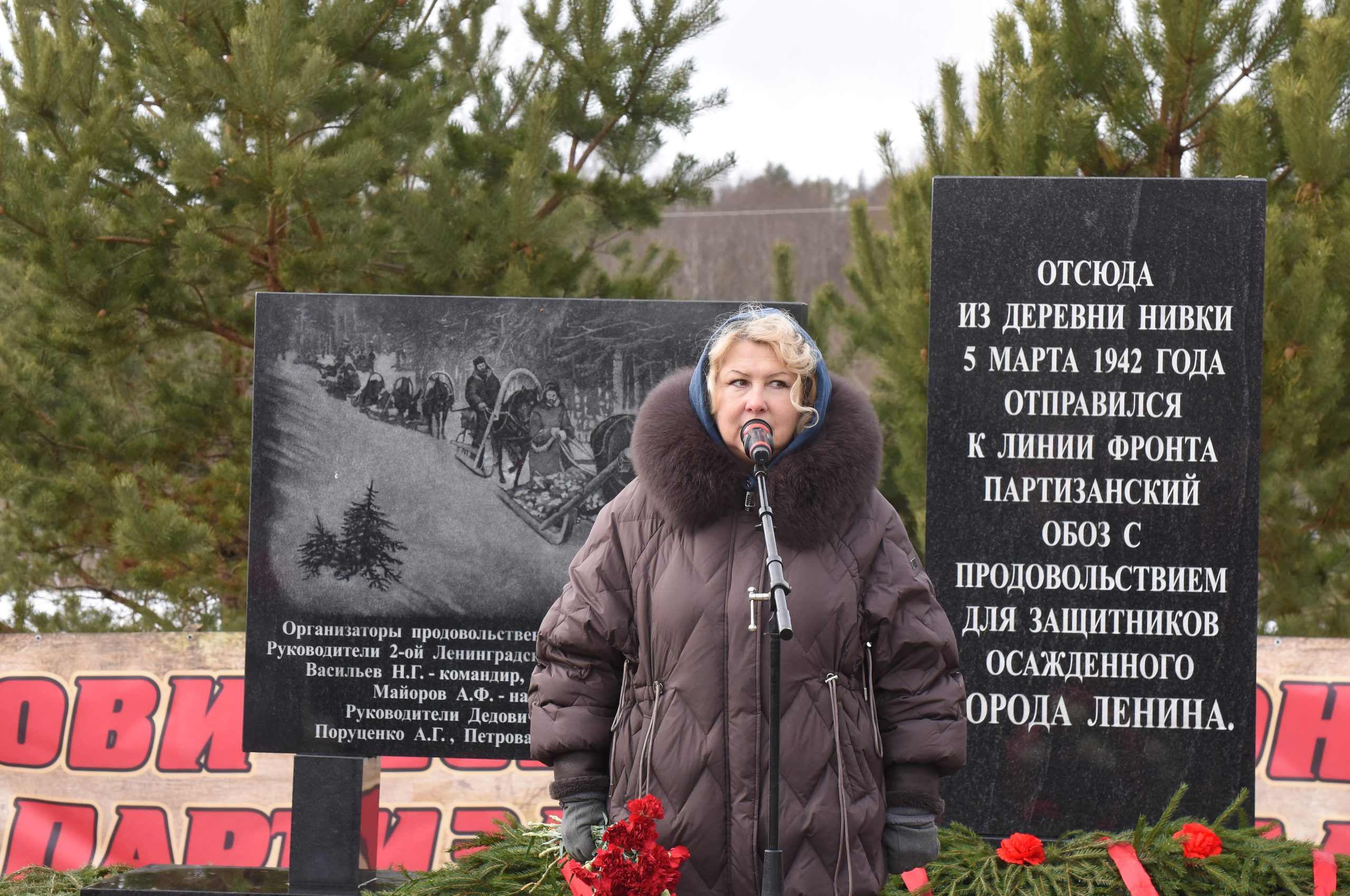 «В деревне Нивки низко голову склоните, // Отдайте дань колхозникам простым, // Которые, забыв про все угрозы, // Оставив дом, родных, детей // В ту зиму грозного 42-го года // Пришли на помощь Партизанскому обозу, // Что продвигался в осаждённый Ленинград!»