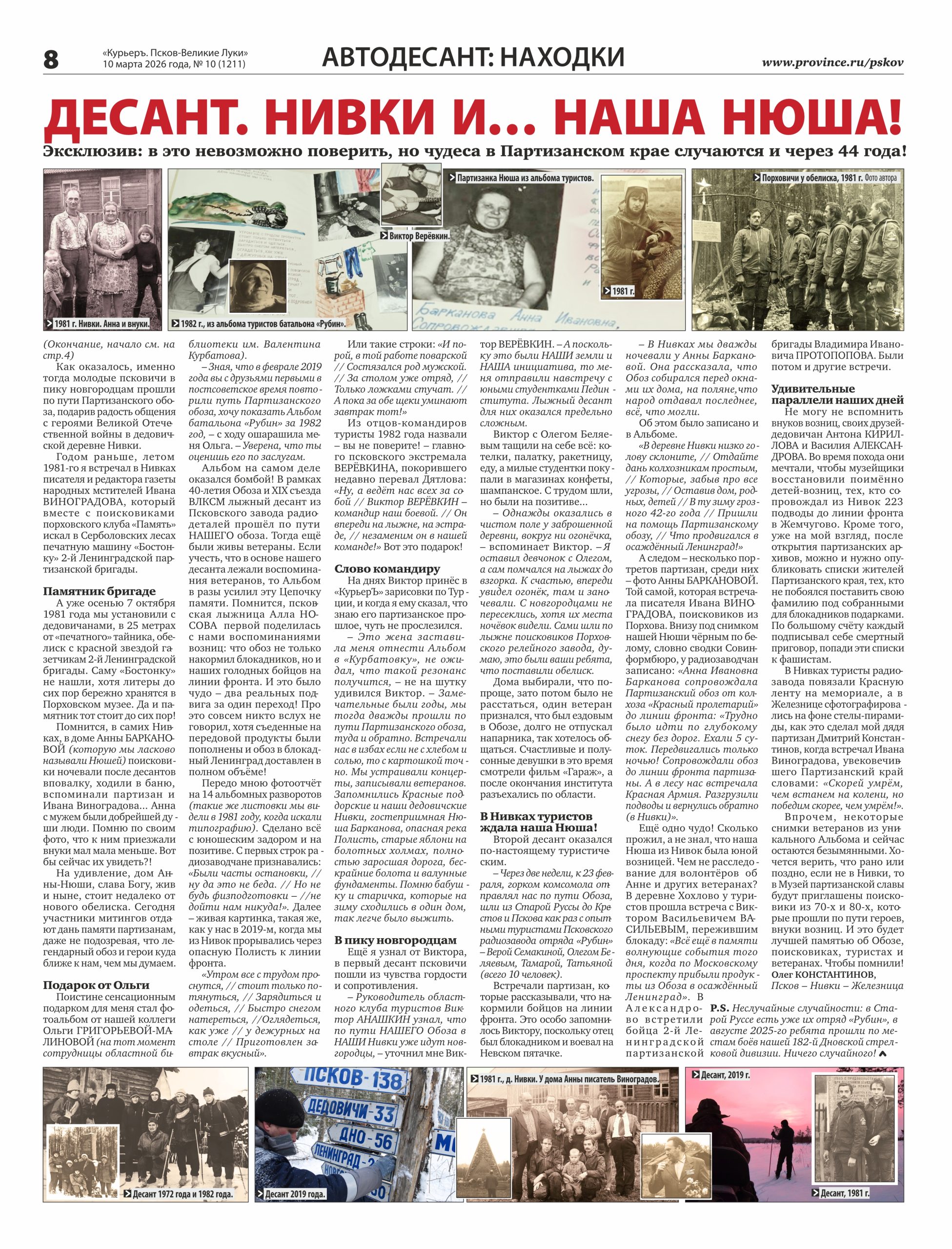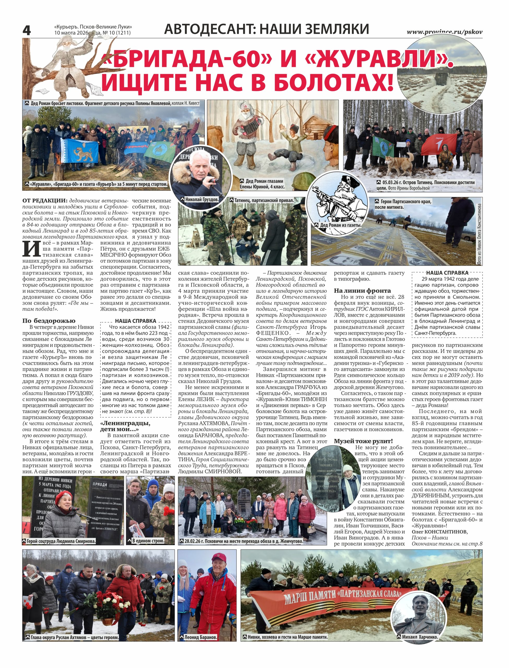 Следим и дальше за патриотическими успехами дедовичан в юбилейный год. Тем более, что к лету мы договорились с хозяином партизанских владений, главой Вязьевской волости Александром Дубряниным, устроить для читателей новые встречи с новыми героями или их потомками. Естественно – на болотах с «Бригадой-60» и «Журавлями»!