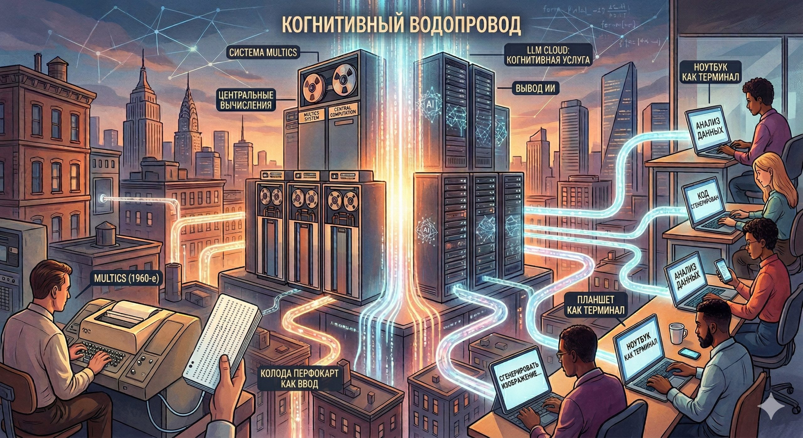 ИИ стал тем самым «водопроводом», о котором мечтали инженеры шестидесятых. Мы открываем кран (запускаем приложение на телефоне), и по трубам (оптоволоконным кабелям интернета) к нам течет чистая когнитивная мощность.