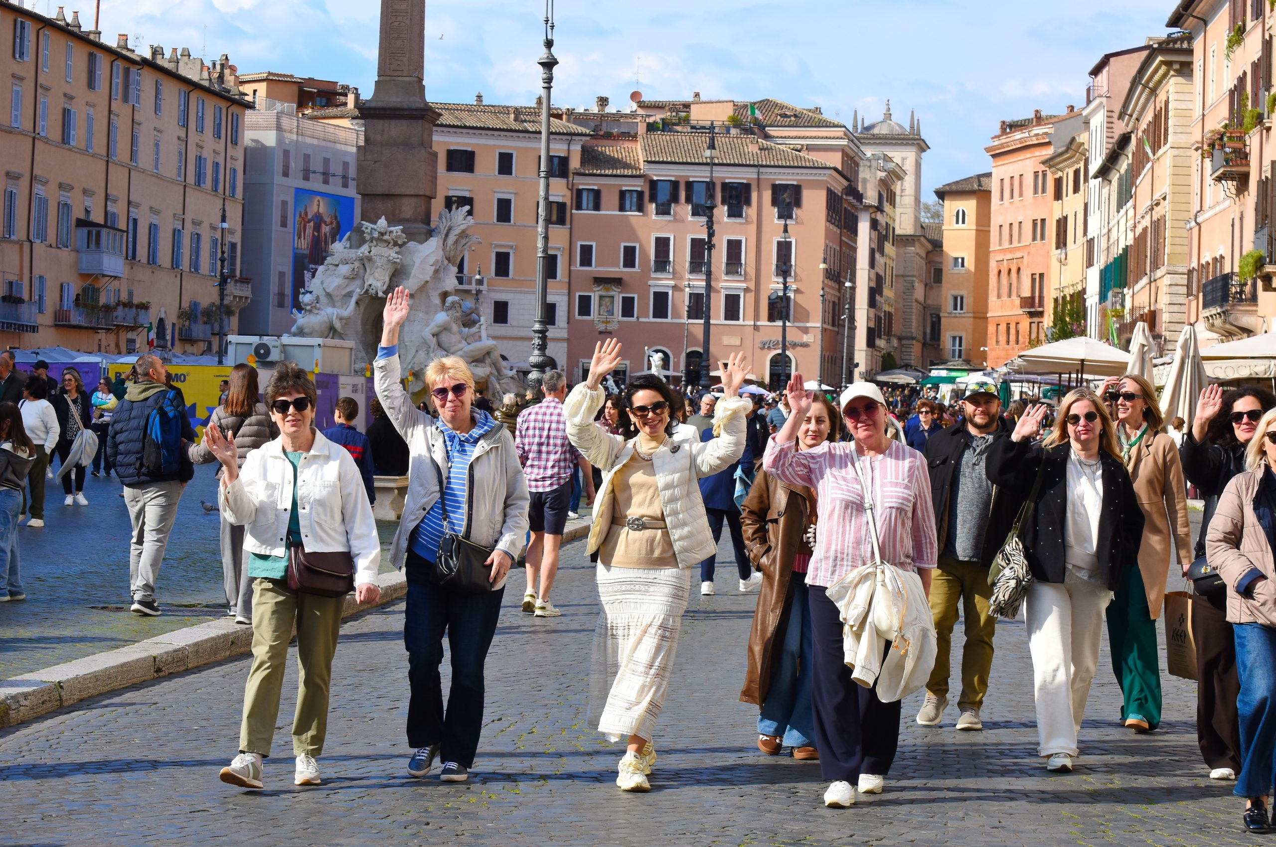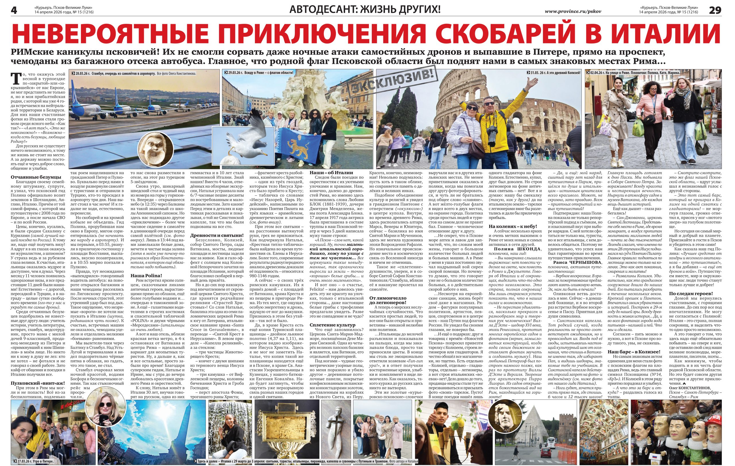 Этот туристический десант не смогли сорвать даже ночные атаки самостийных дронов и выпавшие в Питере, прямо на проспект, чемоданы из багажного отсека автобуса. Главное, что флаг родной Псковской области с ликом барса побывал в самых знаковых местах Рима - в Колизее, Ватикане, на площадях и в пригороде столицы