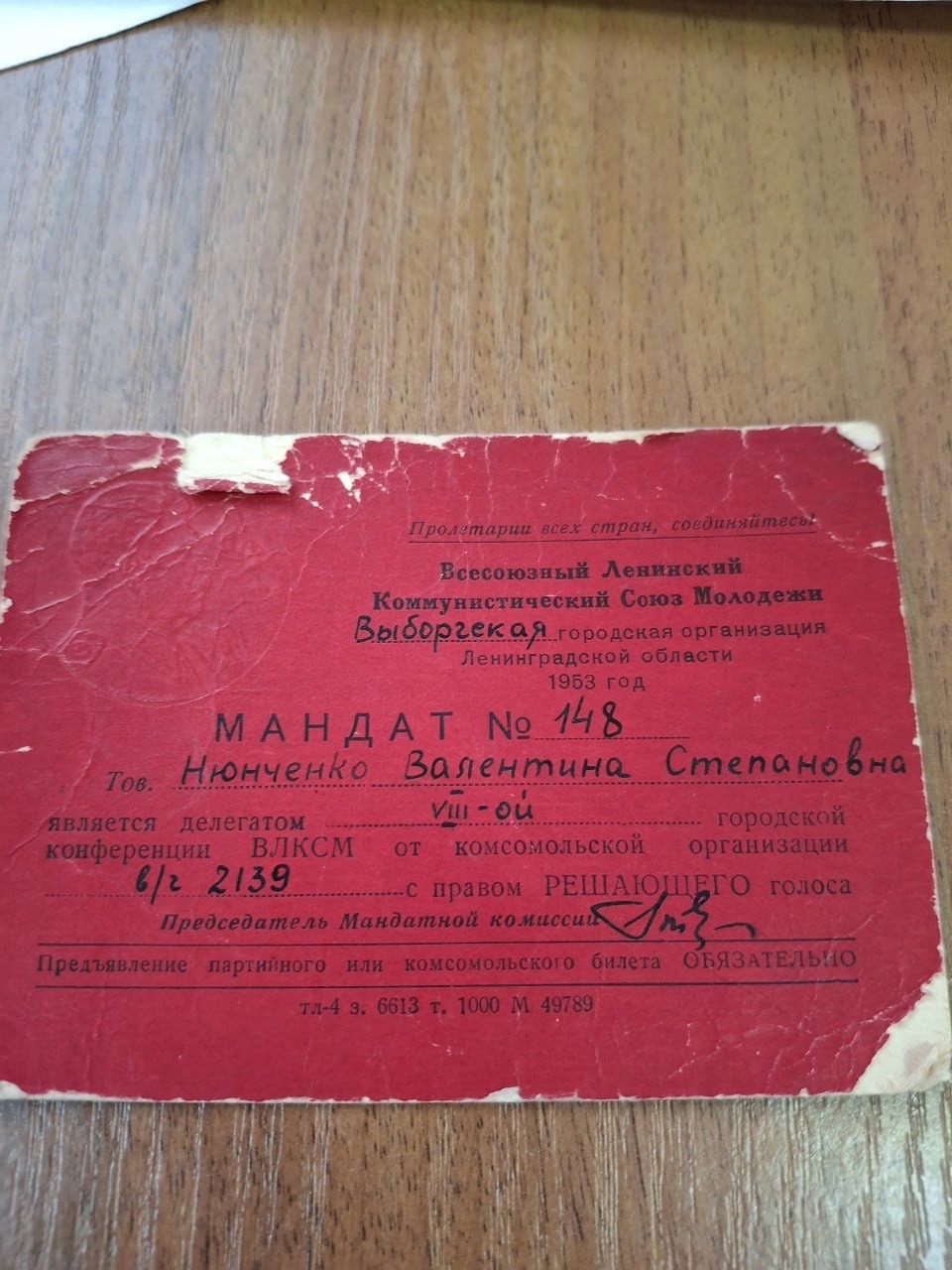 – Мы никогда не гнались за длинным рублём, – рассказывала Валентина Степановна. – У послевоенного поколения были другие ценности. И самым ценным была жизнь. Мы жили не ради себя, ради общего дела. Я четыре года сдавала кровь по 400 граммов для госпиталя, потому что у меня самая востребованная 1-я группа. У меня до сих пор хранится мандат делегата съезда комсомола.