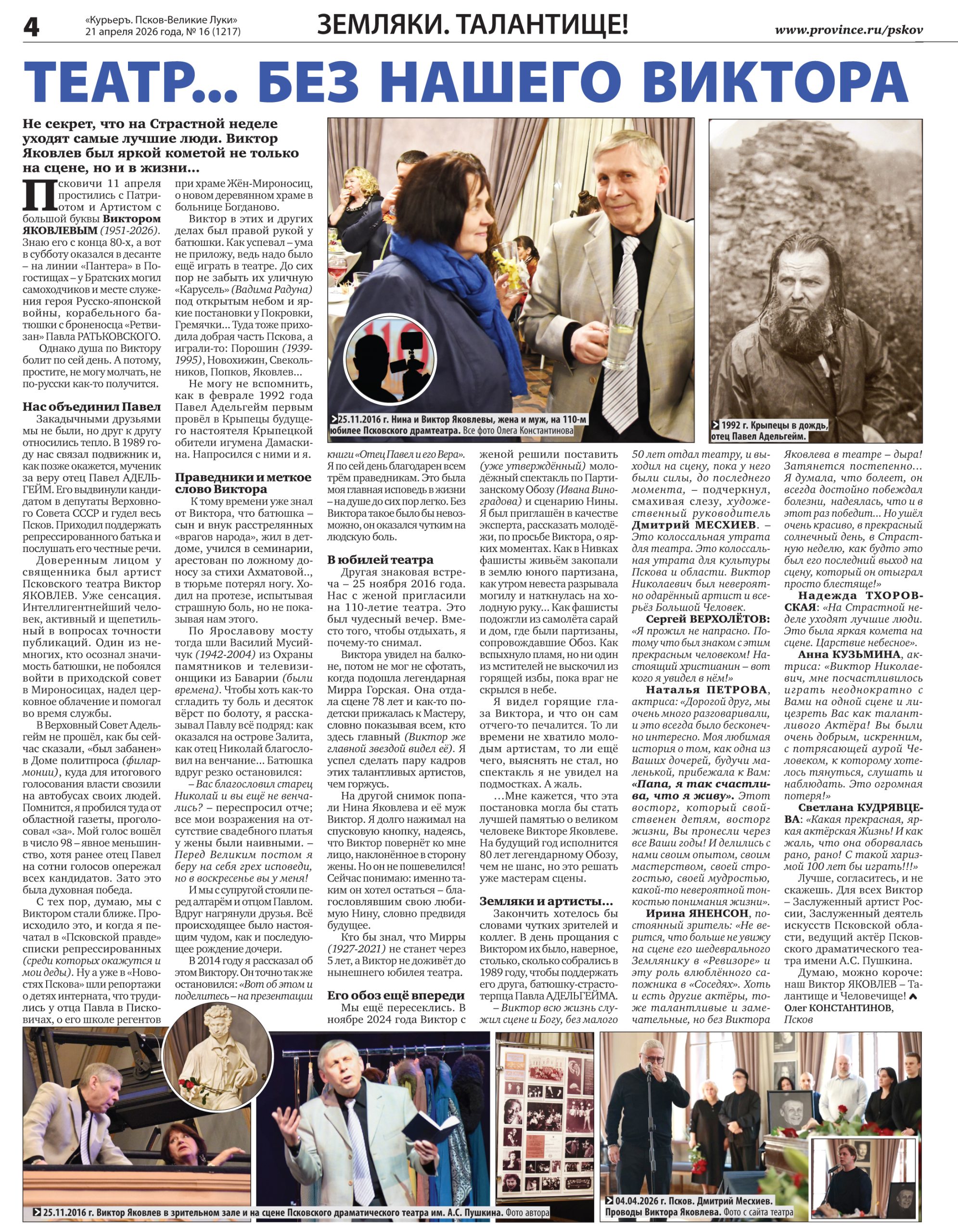 – Виктор всю жизнь служил сцене и Богу, без малого 50 лет отдал театру, и выходил на сцену, пока у него были силы, до последнего момента, – подчеркнул, смахивая слезу, художественный руководитель Дмитрий МЕСХИЕВ. – Это колоссальная утрата для театра. Это колоссальная утрата для культуры Пскова и области. Виктор Николаевич был невероятно одарённый артист и всерьёз Большой Человек.