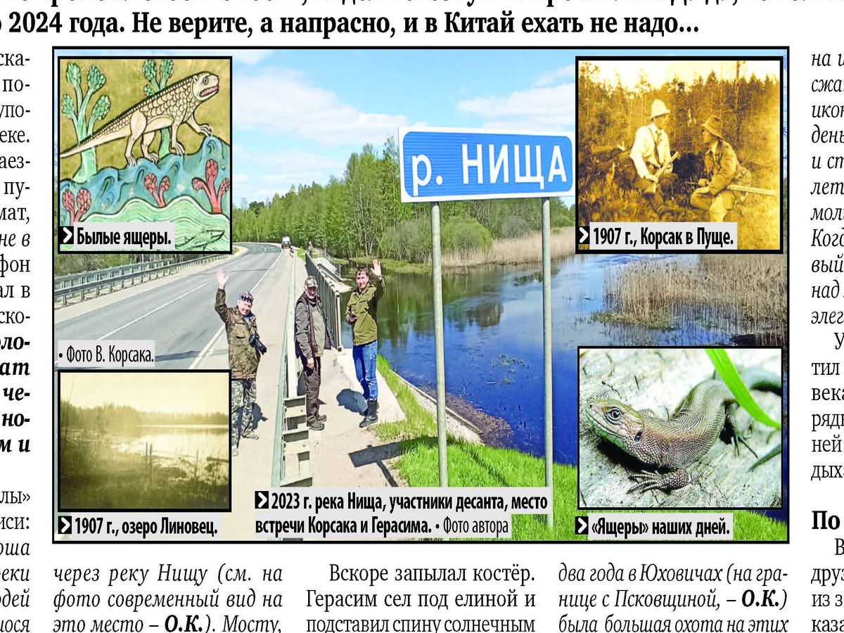 Весной этого года мы с друзьями и проводниками из заповедника решили доказать миру, что древние змееящеры – это не сказка, и попытались найти места былого обитания рептилий. Сейчас это земли Национального парка «Себежский» и «Батькиного» белорусского заказника. Сделать задуманное удалось. («Себежский парк, Осынская Пуща и писатель Корсак», №21, 23 мая). Однако сейчас, перед Новым 2024 годом Зелёного Деревянного ДРАКОНА, хочется закрепить достигнутое.