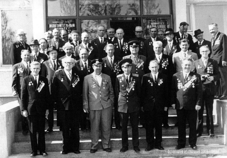 День Победы в Дно. Дяд Яша во втором ряду слева в шляпе. 1975 г.