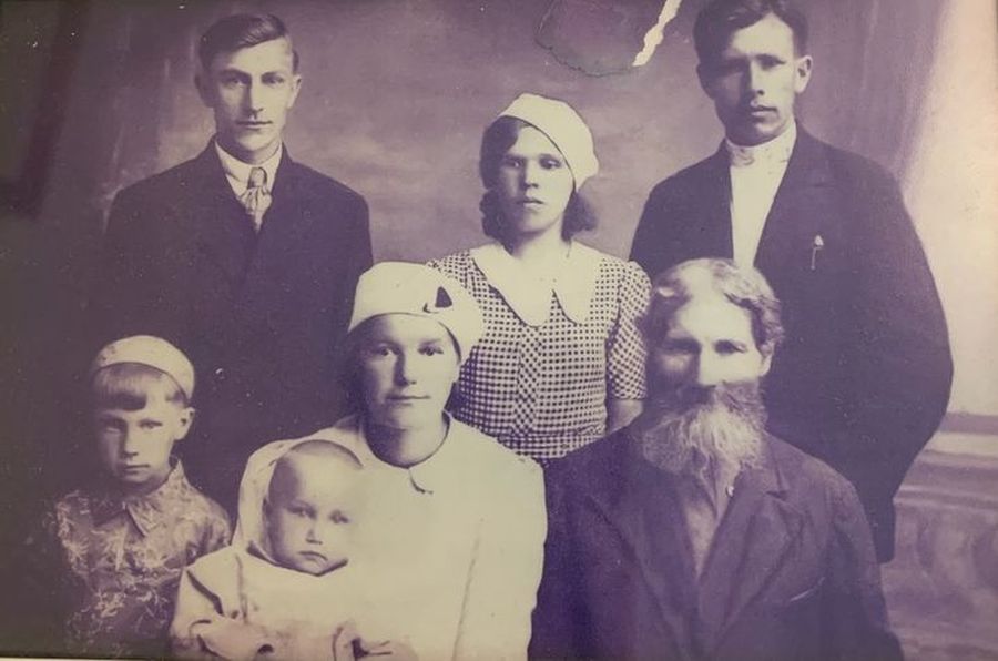 г. Дно, 1940 год. Фроловы. Дед Андрей, сын Николай, Сын Яков с супругой, жена Николая Мария с дочкой Тамарой и сыном Сашей.
