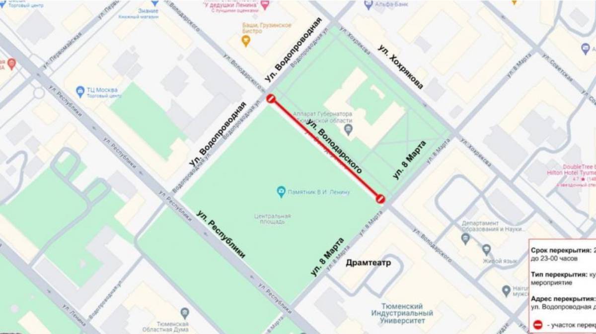 Администрация Тюмени информирует о том, что 27 июля во время празднования Дня города в Тюмени будет прекращено транспортное движение на участке улицы Володарского от улицы Водопроводной до улицы 8 Марта.