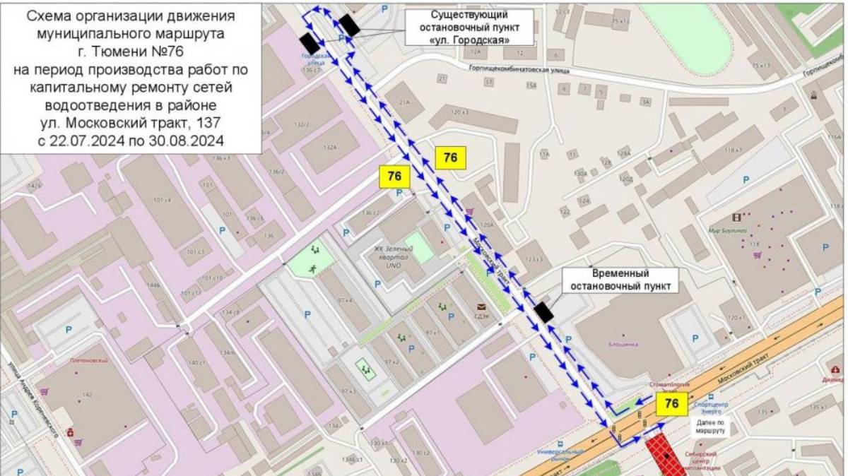 В период с 22 июля по 30 августа в Тюмени временно изменится схема движения автобуса № 76. В связи с проведением работ у дома № 137 по улице Московский тракт автобус №76 будет курсировать в объезд перекрытого участка с соблюдением всех существующих по маршруту движения остановок.