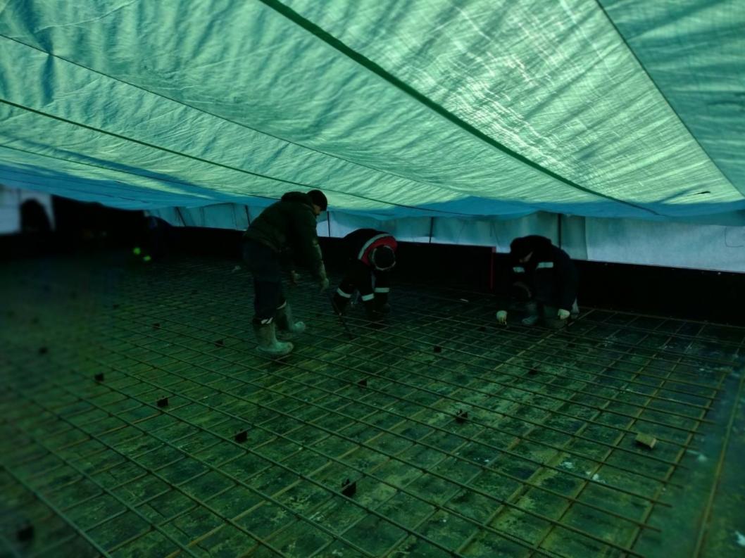 Строительные работы на объекте осуществляются с опережением графика. Дополнительные устройства в виде тентов для защиты от осадков при сборке армированного каркаса применяются с целью сохранения темпов строительства и качества выполнения работ.