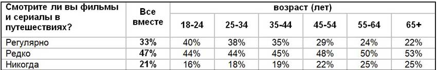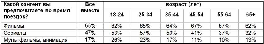 Большая часть из тех, кто смотрит видеоконтент в путешествиях, предпочитают фильмы (65%), на втором месте по популярности — сериалы (47%). Молодежь больше смотрит сериалы: среди респондентов до 24 лет так поступают 53% опрошенных, в возрасте от 25 до 34 лет — 57%, а у путешественников старше 65 лет — только 32%. Анимацию и мультфильмы в путешествиях смотрят 17% опрошенных. Здесь также выше доля у молодого поколения.