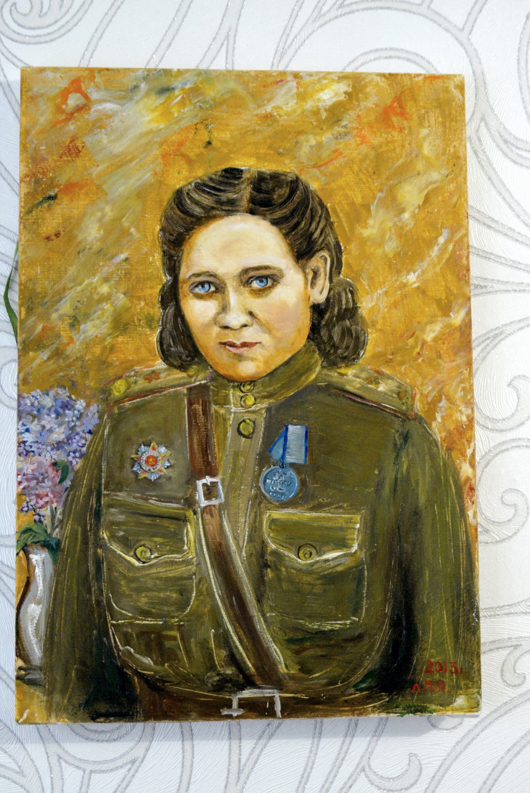 – Вот такой я была, – указала Александра Васильевна на портрет, висевший на стене. На нём была изображена чуть улыбающаяся красивая женщина в военной гимнастёрке, портупее и с орденом на груди.