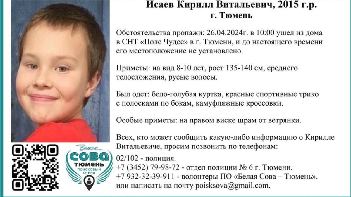 Приметы Исаева Кирилла: внешне выглядит на 10 лет; волосы русые; телосложение- среднее; рост 135-140 сантиметров. Из одежды на ребёнке было: куртка бело-голубая; спортивные трико красного цвета с полосами по бокам; камуфляжные кроссовки. В числе особых примет- наличие шрама на правом виске после перенесённой ветрянки. На звонки мобильного телефона ребёнок не отвечает. В настоящее время к осуществлению процесса по поискам Кирилла Исаева подключены полицейские и волонтёры из поисково-спасательного отряда "Белая Сова – Тюмень".