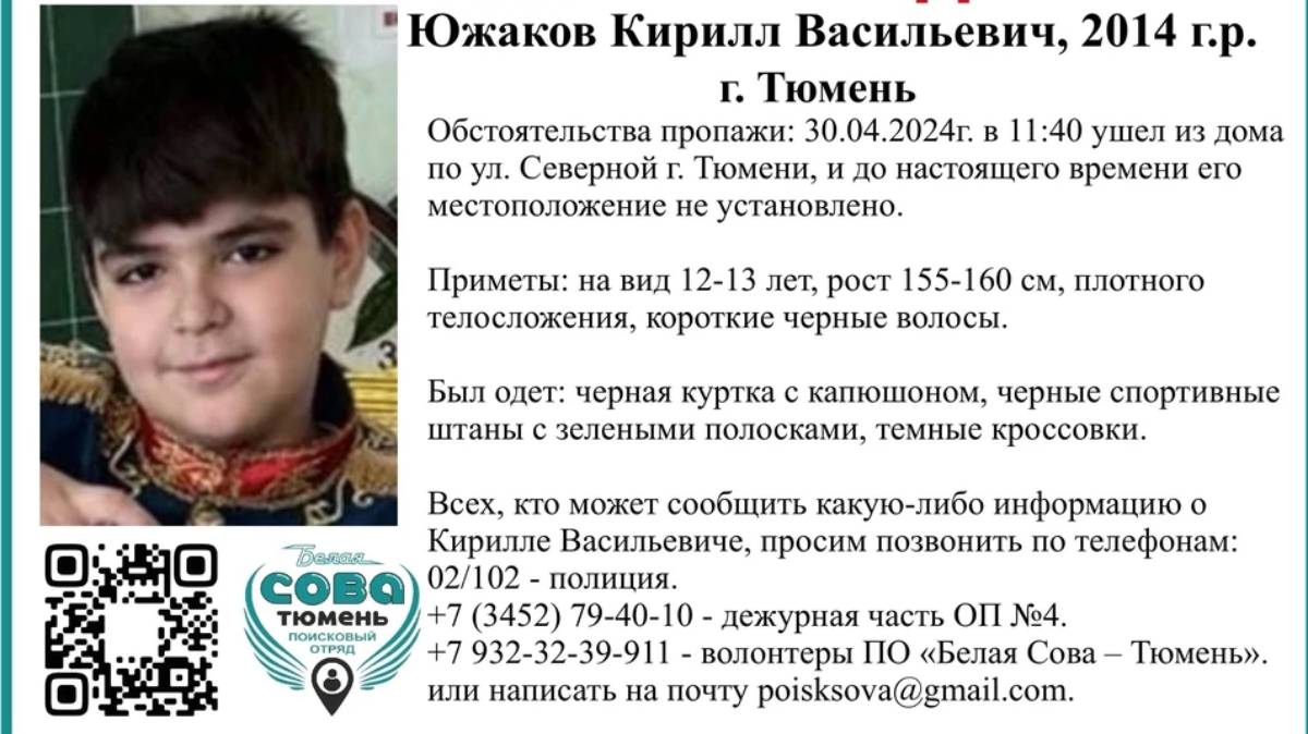 Всех осведомлённых о местонахождении Кирилла Южакова или об информации о самом ребёнке просят позвонить в полицию по телефонам: 02/102. Также всю имеющуюся информацию можно сообщать в ОП №4 г. Тюмени +7 (3452) 79-40-10 и волонтёрам ПО "Белая Сова – Тюмень"- +7 932-32-39-911.