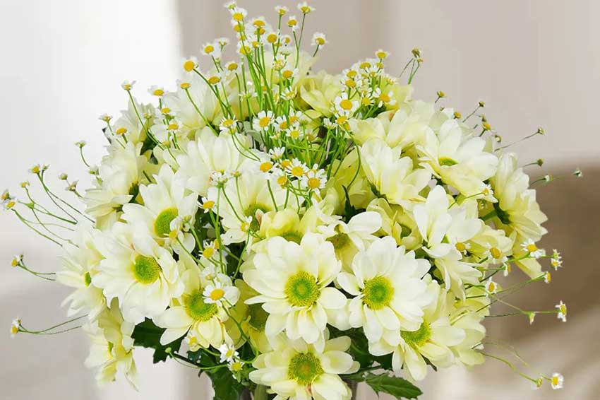 Символ стойкости в мире цветов. Любят солнечный свет и легко переносят жару и сухой воздух, их может погубить разве что палящее в течение длительного времени солнце и температуры 30+. При должном уходе будут стоять в вазе до трех недель свежими и красивыми, могут даже пустить корни. В летнее время особенно хорошо смотрятся в букетах ромашковые хризантемы сочных оттенков и радостные ярко-зеленые сантини.